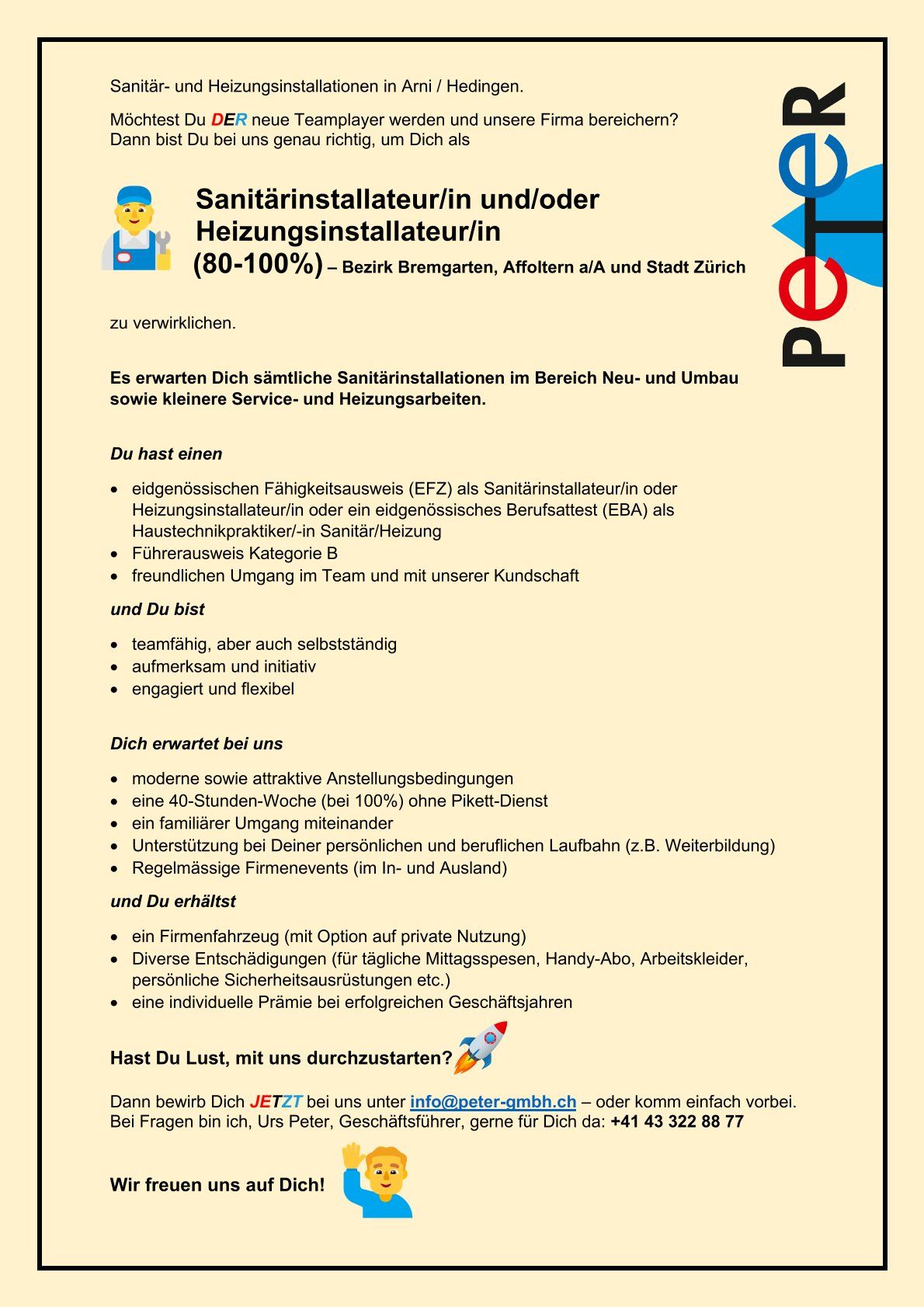 Die Peter GmbH wurde 2002 durch Urs und Tamara Peter in Hedingen gegründet. Nach einem stetigen Wachstum sind heute 10 Personen im Service, auf dem Bau und in der Planung beschäftigt. Ende 2011 konnte die Peter GmbH ein eigenes Büro- und Werkstattgebäude in Arni beziehen.